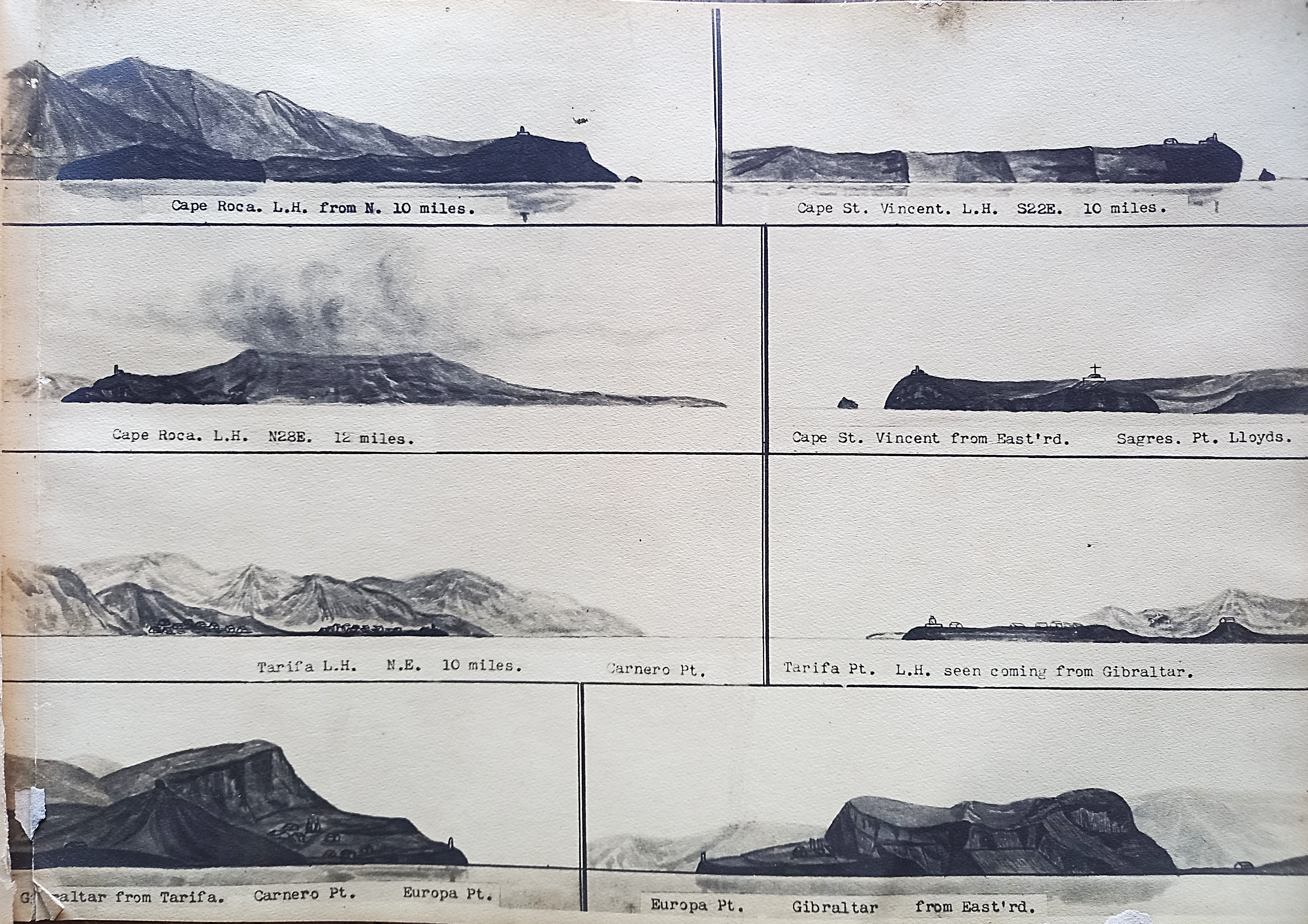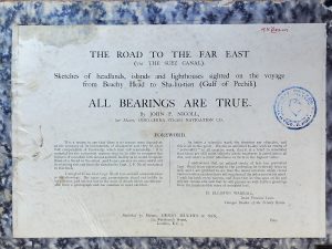 Very rare undated edition of a collection of sketches of all the capes, islands and lighthouses seen on a voyage done by the author from Beachy Head in the southwest of England to the Gulf of Pechili (China). John F. Nicoll was a Master in the service of the Indo-China Steam Navigation Company, founded in 1881 and liquidated in 1974. Little more is known about him than what his colleague H. Elliston Warrall provides in the succinct foreword that appears on a sheet attached to the back of the book’s cloth cover. Except for a typewritten text, the rest of its content is reduced to the very fine sketches. In this way, all information about this edition must be extracted from what appears printed on that page, which in red ink reads “M. S. CARDIUM”, what seems to link the possession of the book with the motor ship thus named. It is known that the prologue writer Warrall was at that moment in the Blue Funnel Line and there are documentation that shows he transported emigrants to Australia as a captain of ship before the First World War, as well as his status as a Younger Brother of the Trinity House, the institution responsible for operation and care of lighthouses in Great Britain.