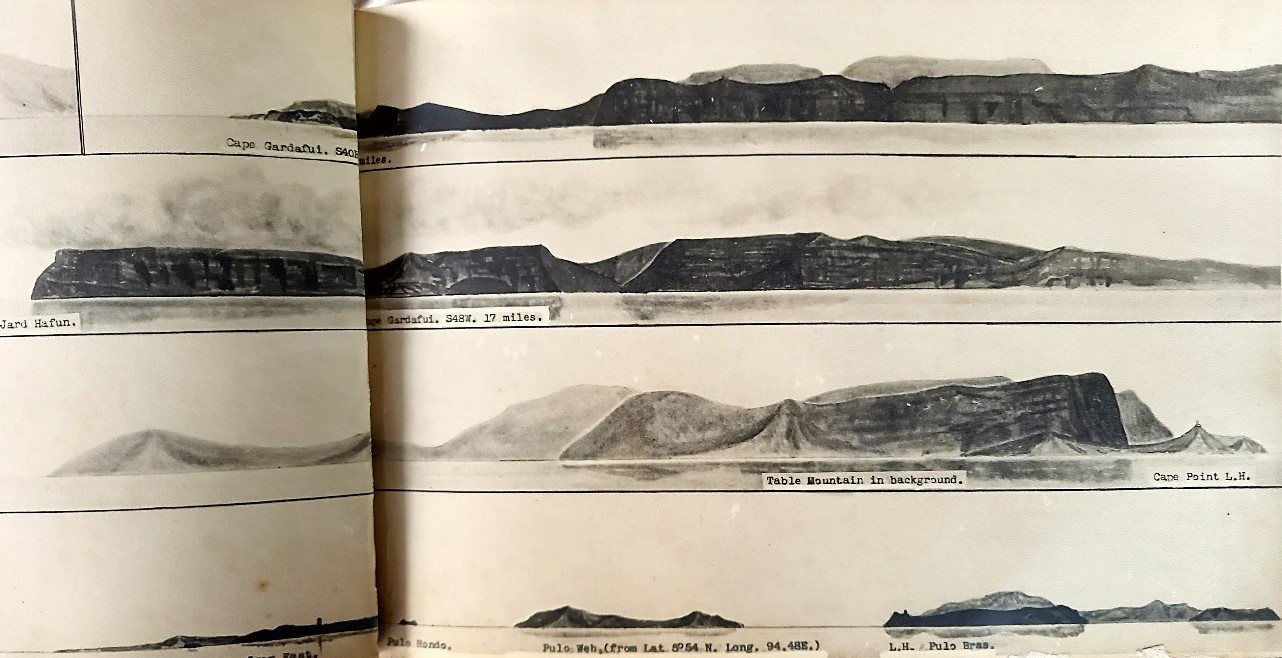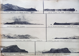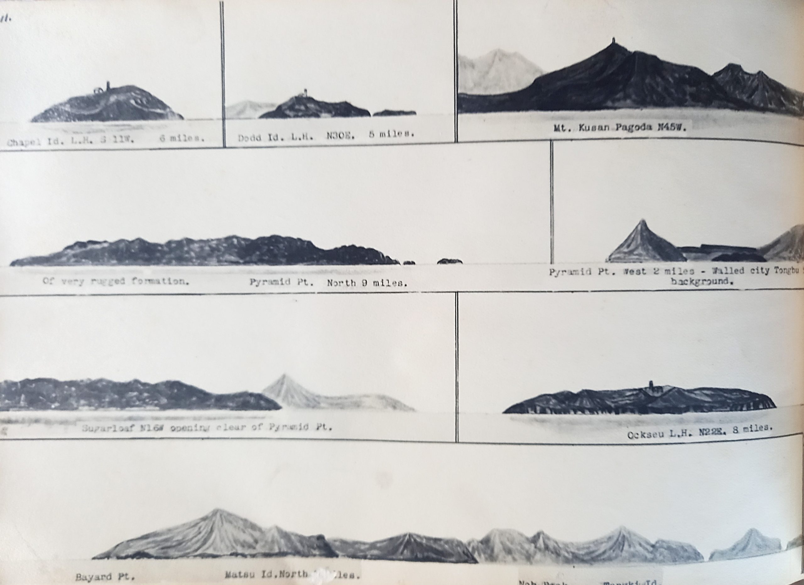 Subtitle: Sketches of headlands, islands and lighthouses sighted on the voyage from Beachy Head to Sha-liu-tin (Gulf of Pechili). All Bearings are true.