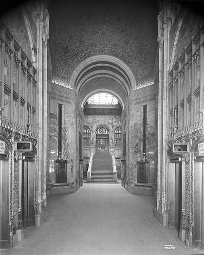Staircase leading to the Irving National Bank in the main floor. Photography, Wurts Bros. c. 1910 Museum of the City of New York